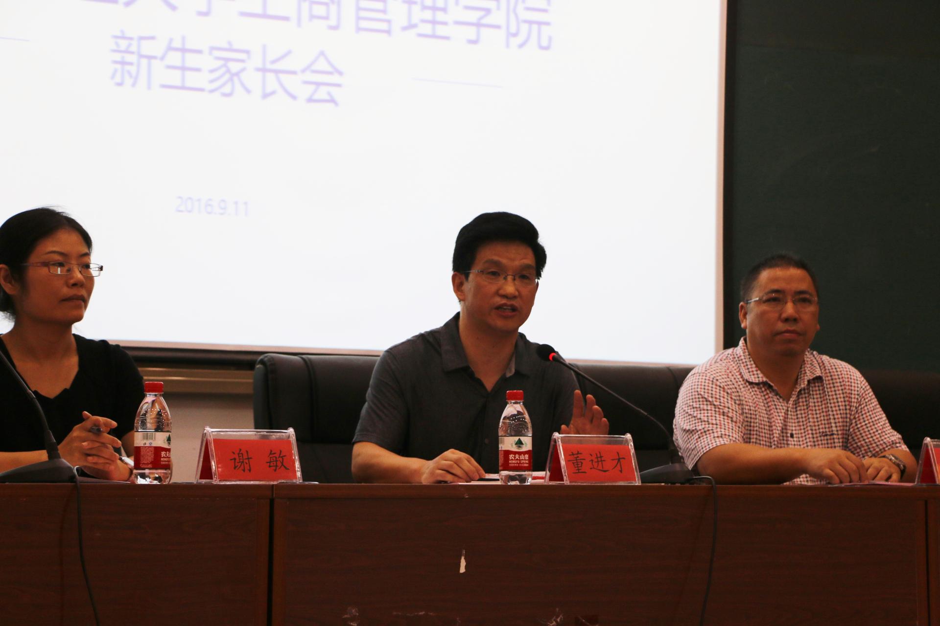 院长董进才、党委书记黄卫华、副院长王建明、倪文斌,带班辅导员以及新生家长们共同参加此次家长会,党委副书记谢敏老师主持会议。