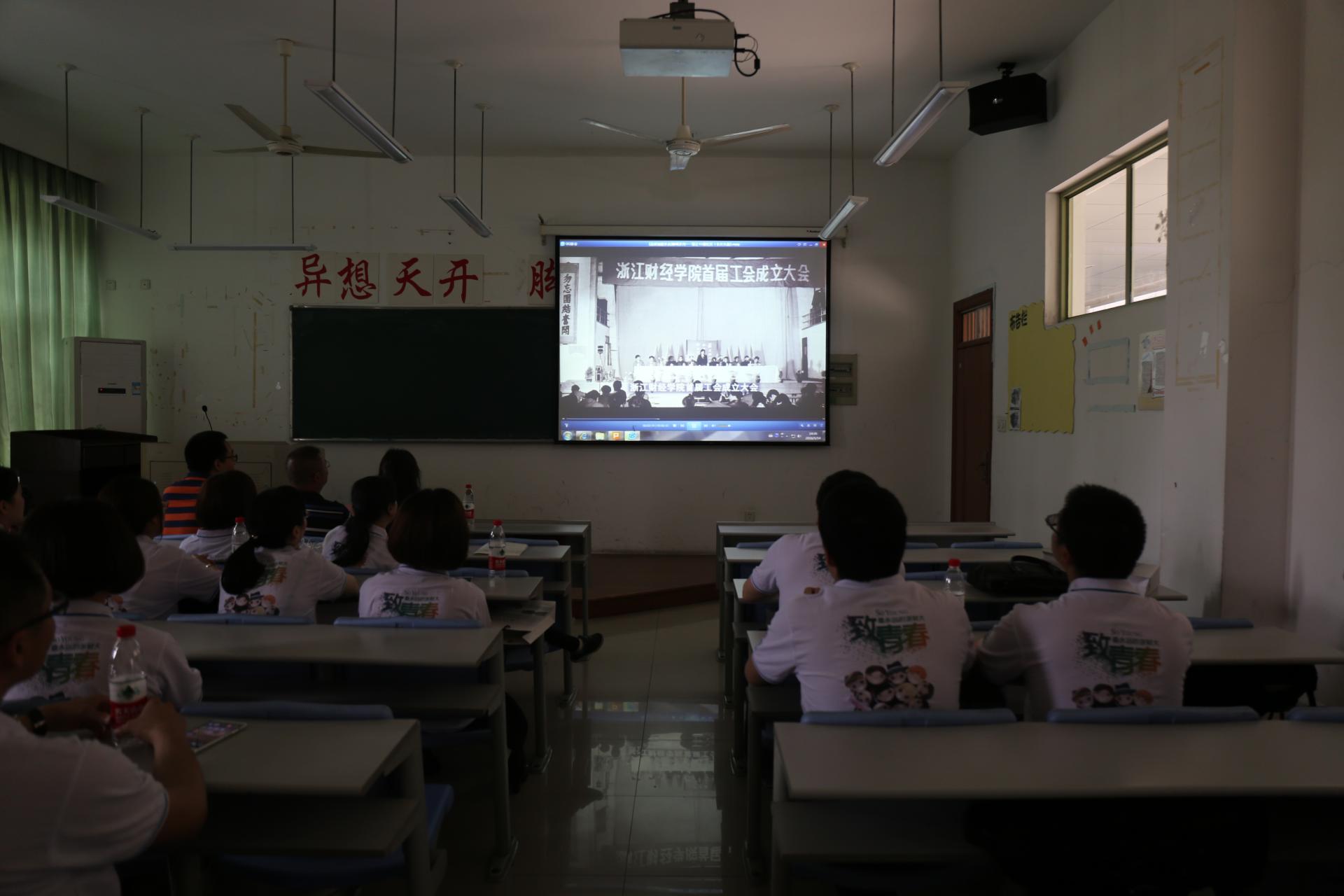 楼110教室进行了02级校友特殊的主题班会。校友们齐聚一室,找到当年熟悉的同桌,重温当年的记忆。班会首先安排的是观看浙财大的纪录片,用影像回忆浙财的过去。在观影过程,有几位校友激动地指出:“那是醉墨池,我以前经常去”,一下子引起了其他同学的共鸣。