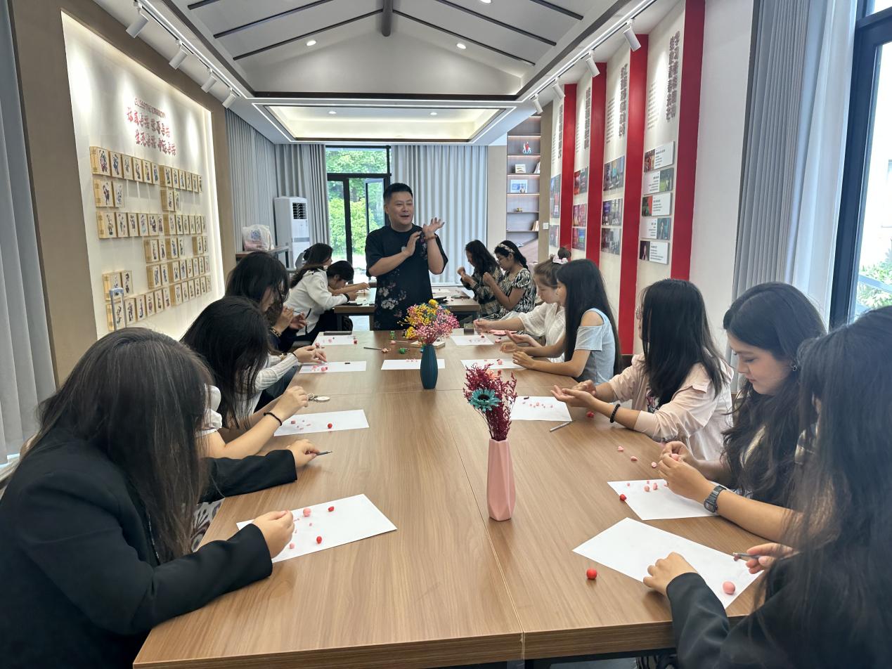 非遗传承人丁建华老师深入浅出地讲解黏土捏塑的历史与技法,揉、搓、捏、刻,每一个动作都充满神韵,在示范捏制哪吒形象时,传承人从哪吒标志性的乾坤圈、混天绫,到独特的发型、神态,都进行了细致入微的展示,引得在场学生们跃跃欲试,新疆少数民族学生们围坐在传承人身边,眼神中满是对这门古老技艺的好奇与期待,他们认真聆听,不时拿起工具尝试模仿,现场气氛热烈非凡。