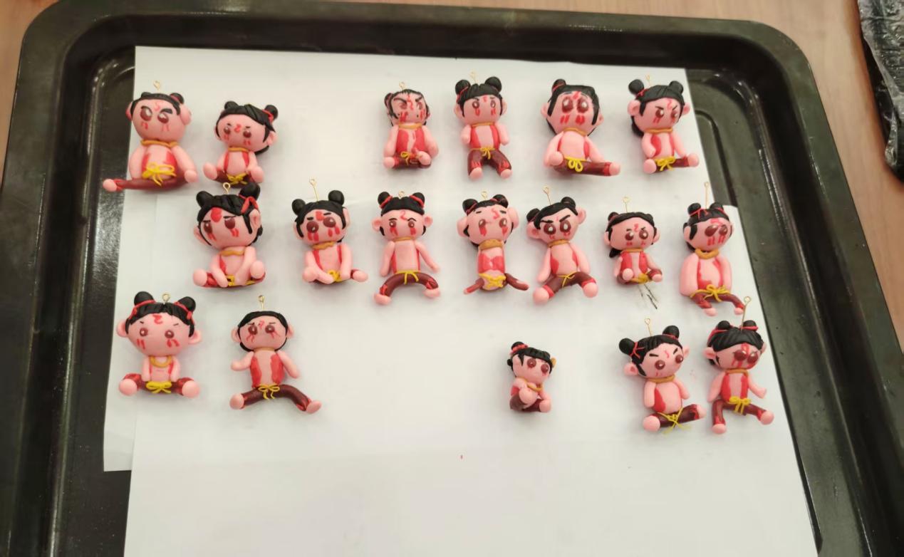 活动现场,新疆各少数民族学生结对创作,在交流中增进理解,维吾尔族学生阿依仙木古丽负责哪吒发型的塑造,哈萨克族同学帕力扎专注火焰纹的绘制,两人反复调整细节,最终呈现出一件兼具民族特色与艺术美感的作品。活动尾声,各族学子手持作品合影留念,背景墙上“中华民族一家亲”的标语与黏土哪吒的火焰纹交相辉映,成为民族团结的生动注脚。