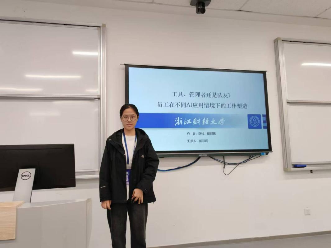 2023级硕士研究生戴郑瑶与导师陈帅副教授团队合作的论文《工具、管理者还是队友:员工在不同AI应用情境下的工作塑造》受邀汇报。该论文聚焦AI在组织中的多样化应用情境,明确界定了AI作为工具、管理者和队友三种典型角色,结合认知评价理论和相关文献系统梳理,从“情境感知—认知塑造—行为塑造”的研究脉络出发,深入探讨了员工在不同AI情境中如何主动调整自身的认知模式与行为策略。这一研究不仅揭示了员工在技术变革中的适应机制,还阐明了多样化AI情境对员工工作塑造行为的驱动作用,为组织在技术与人力资源协同发展中提供了全新视角和理论指导。