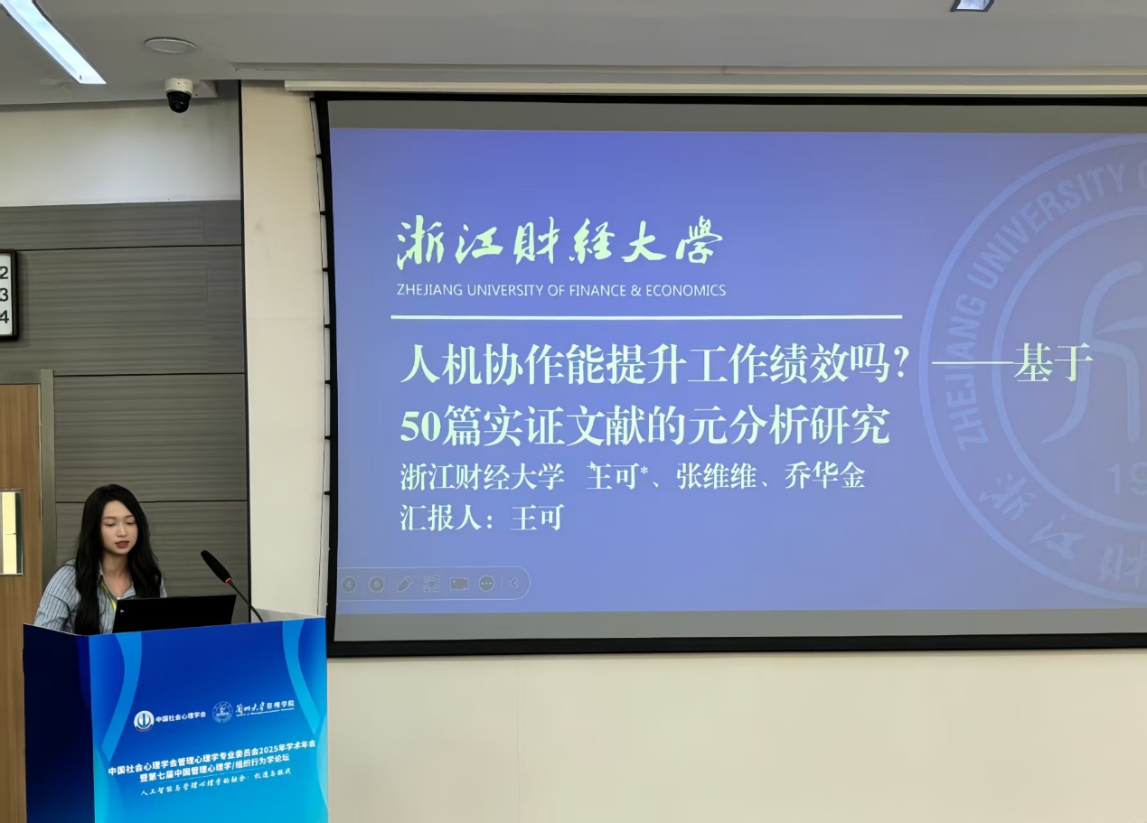 硕士研究生王可、乔华金受邀在平行论坛中汇报论文,并与现场学者进行了深入交流。2024级硕士研究生王可与导师张维维副教授合作的论文《人机协作能提升工作绩效吗?——基于50篇实证文献的元分析研究》在分论坛中宣读。该研究通过系统梳理现有实证文献,运用元分析方法揭示了人机协作对工作绩效的影响机制,为人工智能背景下的人机协同管理实践提供了理论依据与实证支持。