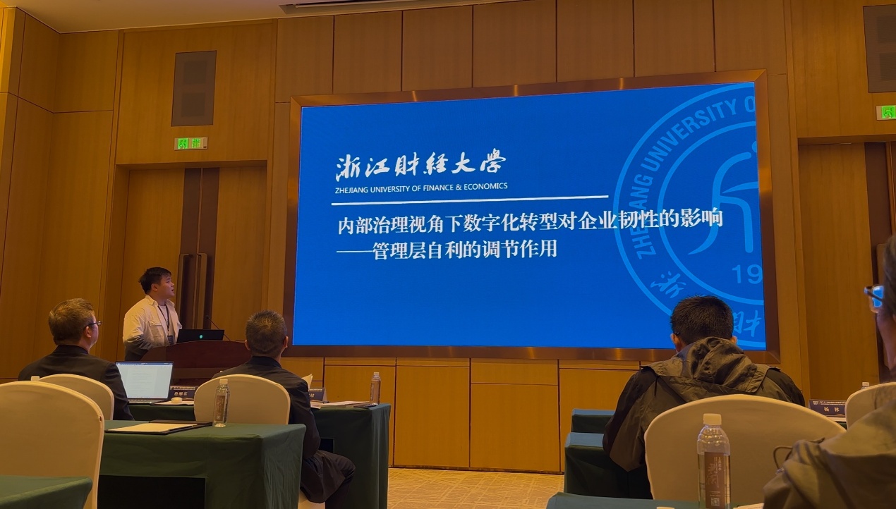 2024级技术经济及管理专业硕士研究生冯子宸与导师孙凯教授合作的论文《内部治理视角下数字化转型对企业韧性的影响——管理层自利的调节作用》受邀在年会上进行汇报。该论文聚焦数字化转型与企业韧性之间的关系,并分析管理层特质的调节作用和危机情境下的实际效能,特别关注了内部治理视角这一特定情景,揭示了数字化转型进程与组织韧性提升的关联规律,为企业推进数字化进程提供了新的理论视角与管理启示。