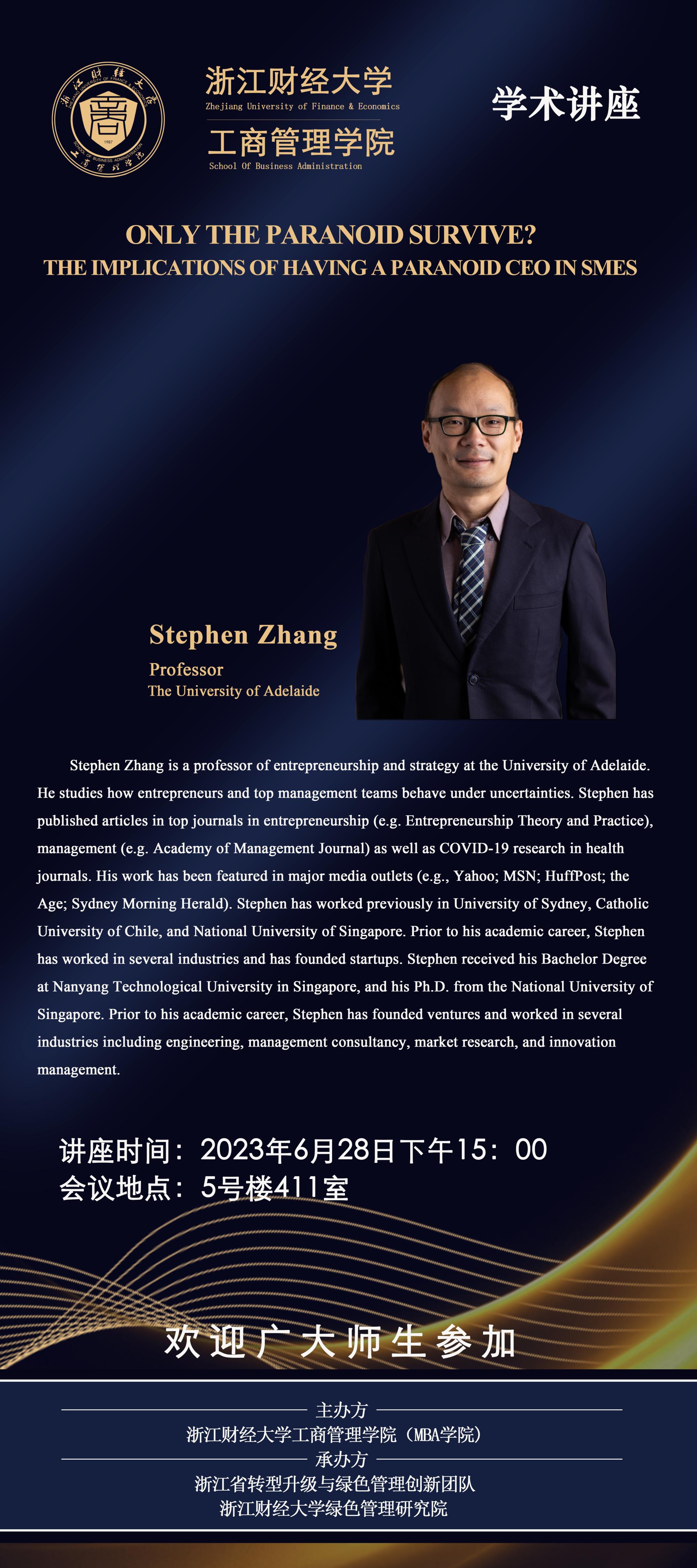 【讲座预告】Professor Stephen Zhang: Only the Paranoid Survive? The Implications of Having a Paranoid CEO in SMEs