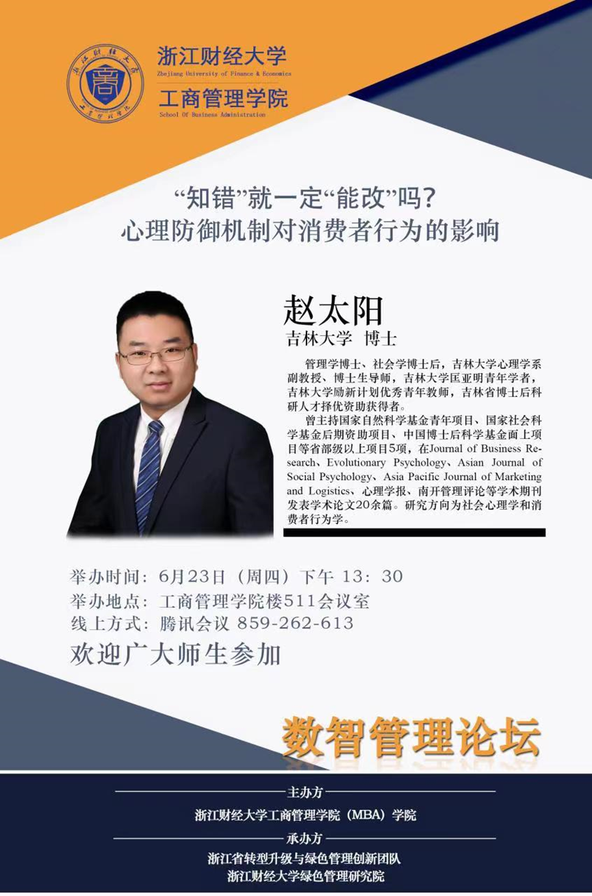 【院级研究中心讲座预告】赵太阳教授:“知错”就一定“能改”吗?心理防御机制对消费者行为的影响