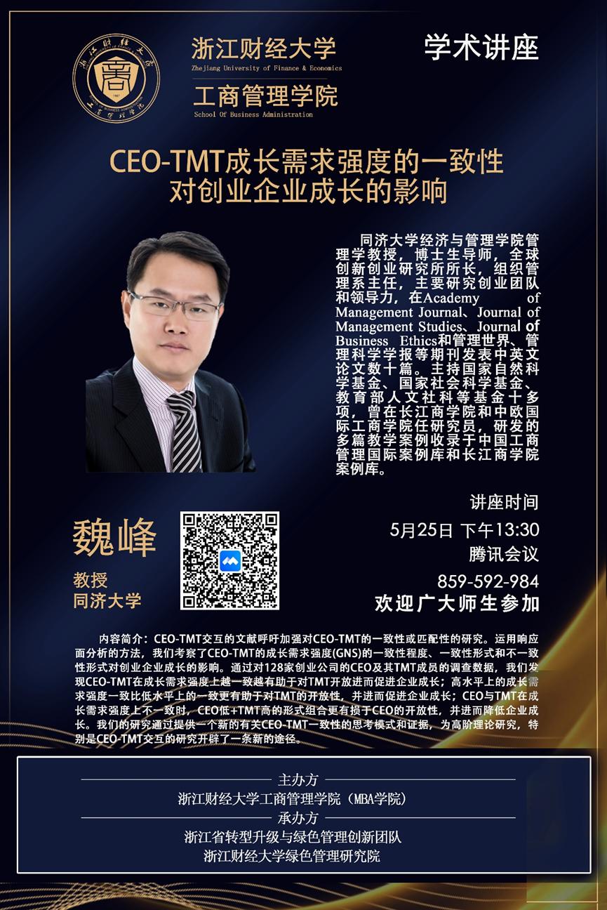 【讲座预告】魏峰教授:CEO-TMT成长需求强度的一致性对创业企业成长的影响