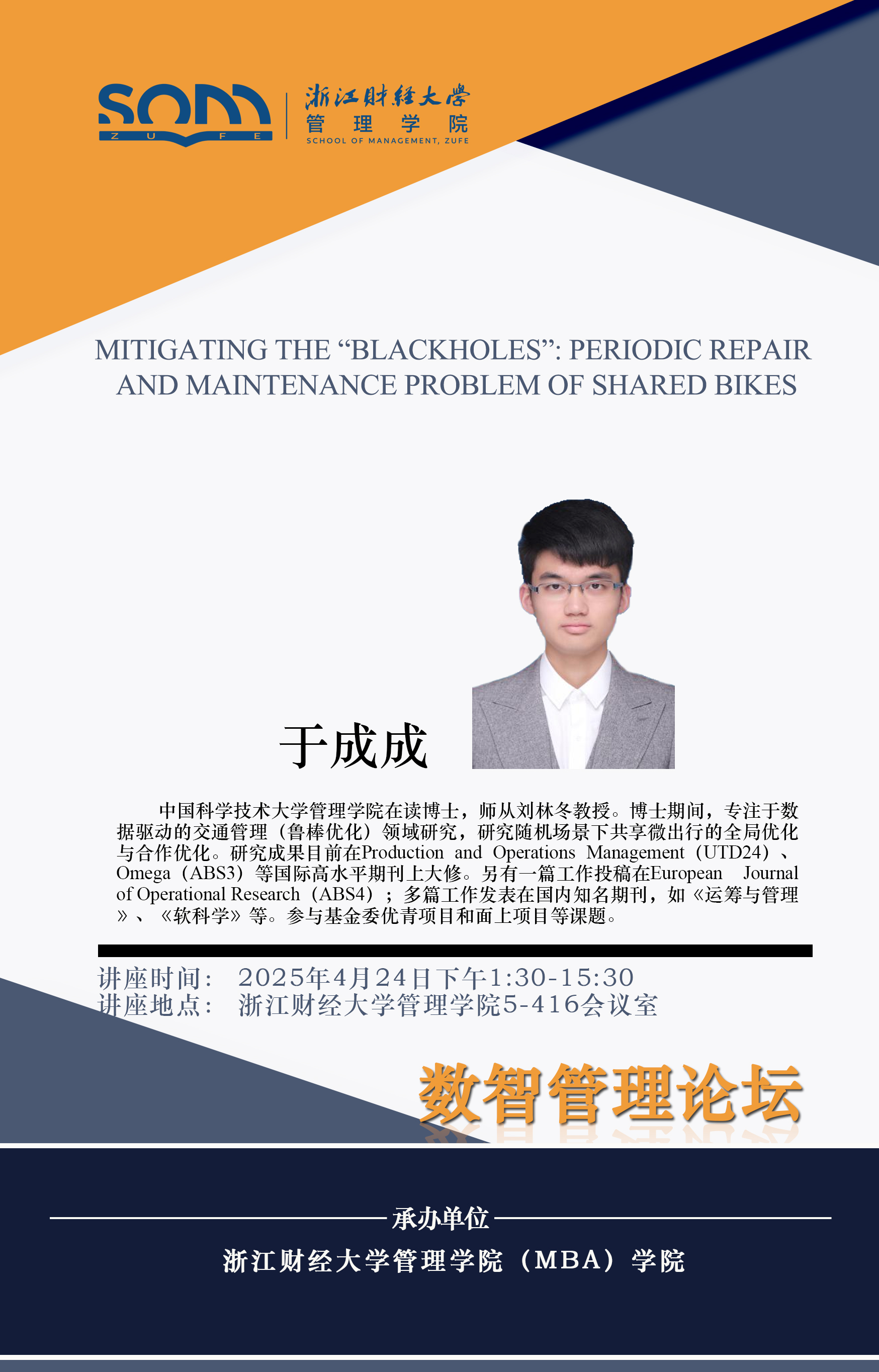 六合彩预测 新财经战略系列学术活动2025年第21期【学术报告】于成成:Mitigating the “Blackholes” Periodic Repair and Maintenance Problem of Shared Bikes