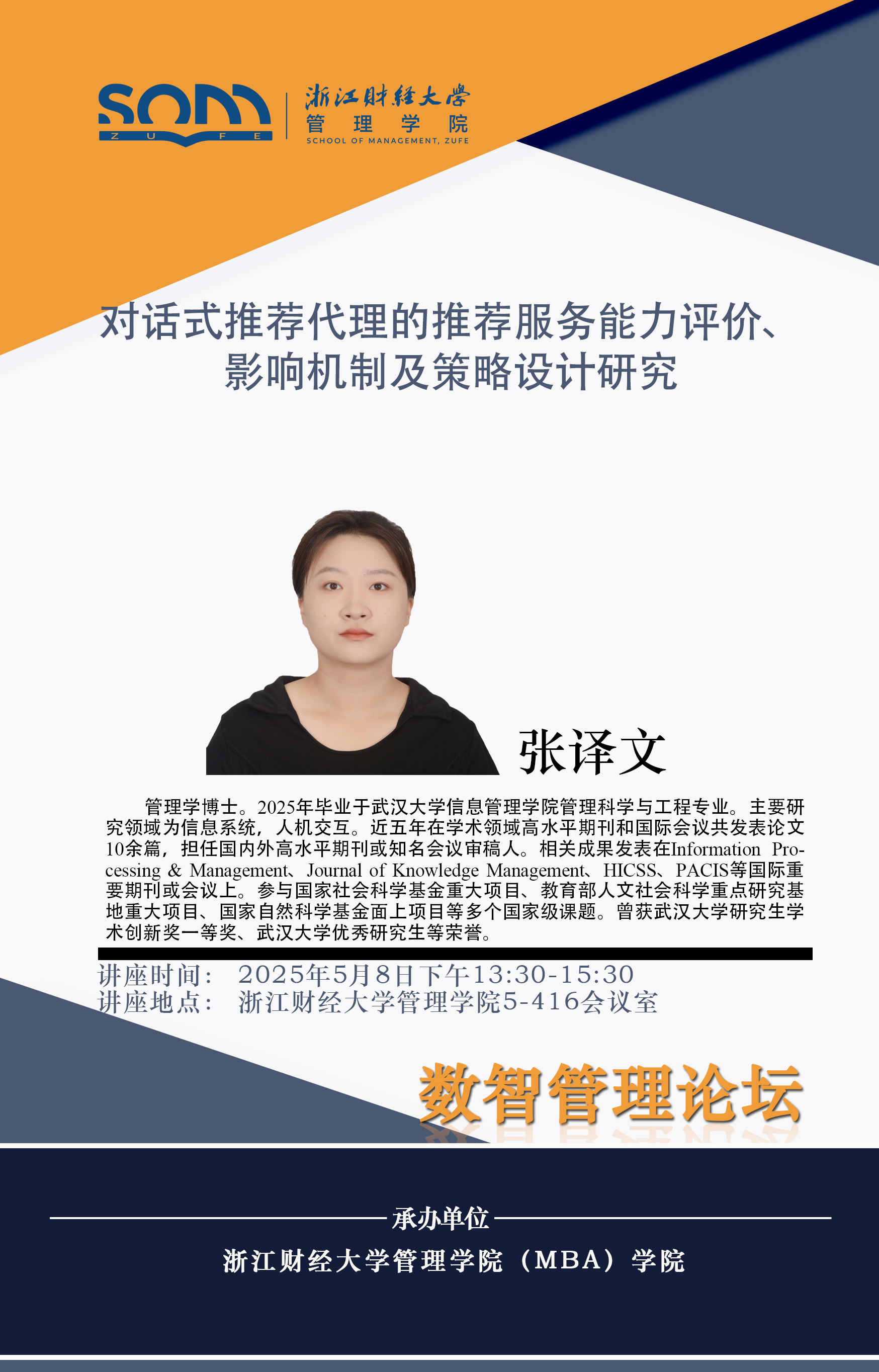 六合彩预测 新财经战略系列学术活动2025年第32期【学术报告】张译文:对话式推荐代理的推荐服务能力评价、影响机制及策略设计研究