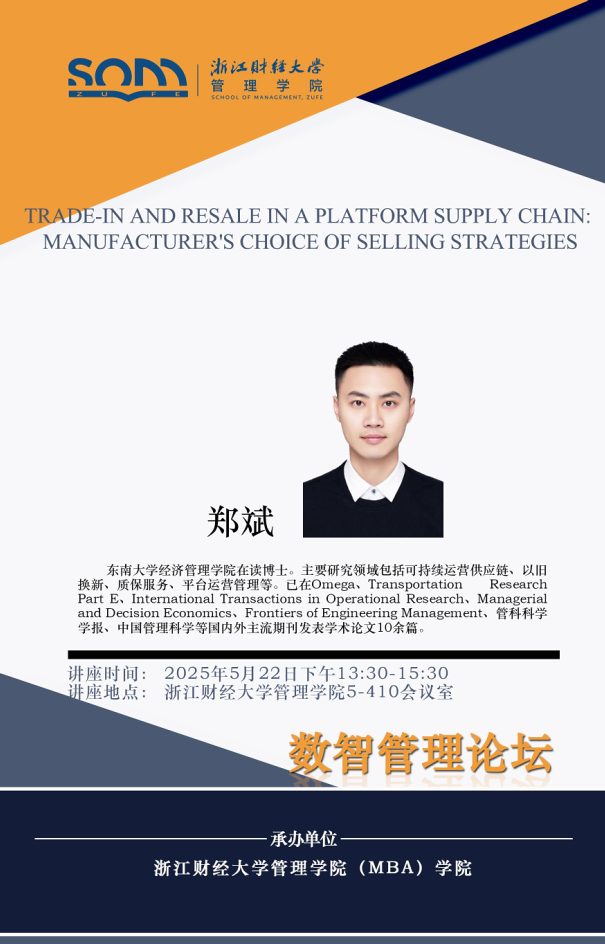 六合彩预测 新财经战略系列学术活动2025年第39期【学术报告】郑斌:Trade-in and resale in a platform supply chain Manufacturer's choice of selling strategies.jpg