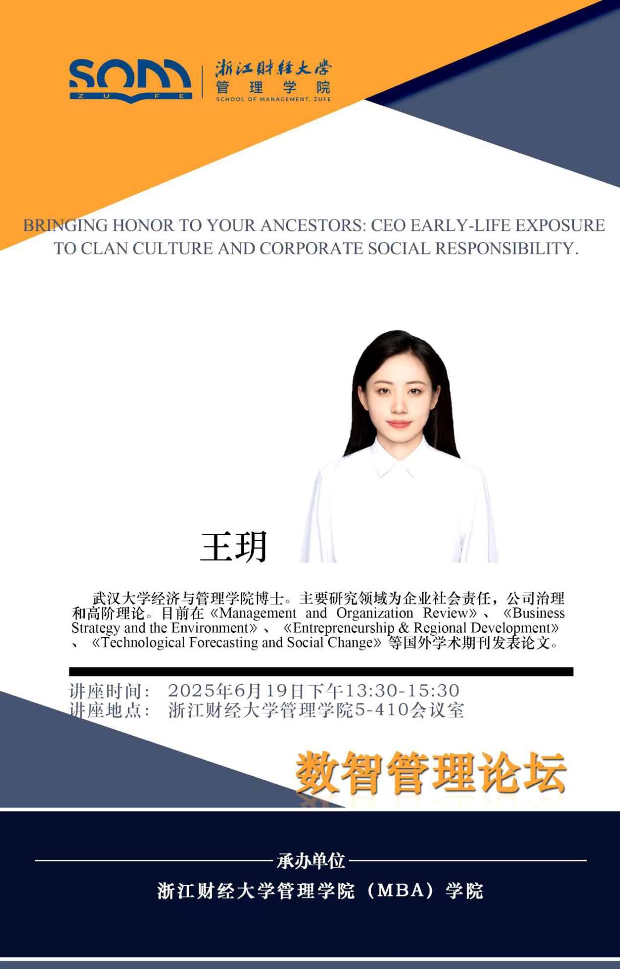 六合彩预测 新财经战略系列学术活动2025年第43期【学术报告】王玥:Bringing Honor to Your Ancestors CEO Early-Life Exposure to Clan Culture and Corporate Social Responsibility