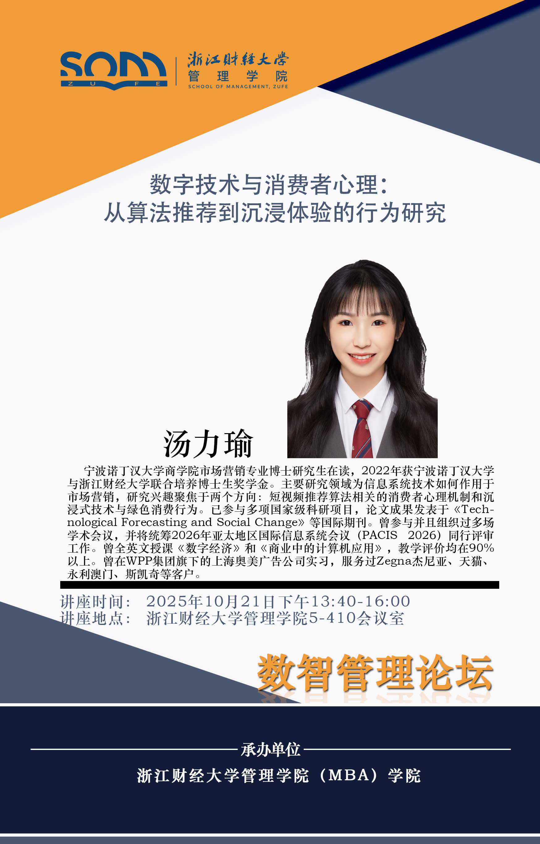 六合彩预测 新财经战略系列学术活动2025年第55期【学术报告】汤力瑜:数字技术与消费者心理:从算法推荐到沉浸体验的行为研究