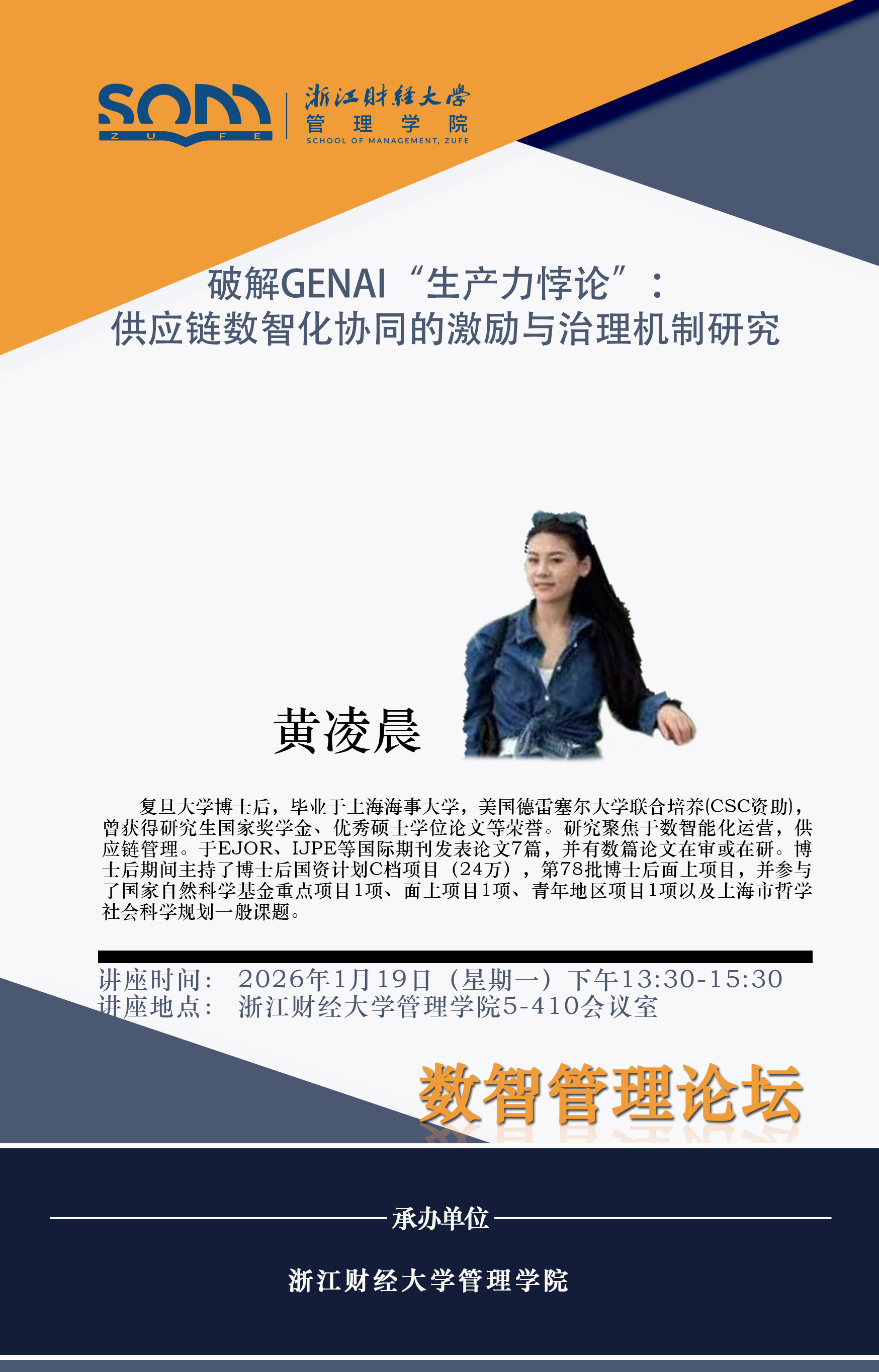 六合彩预测 新财经战略系列学术活动2026年第4期【学术报告】黄凌晨:破解GenAI“生产力悖论”:供应链数智化协同的激励与治理机制研究