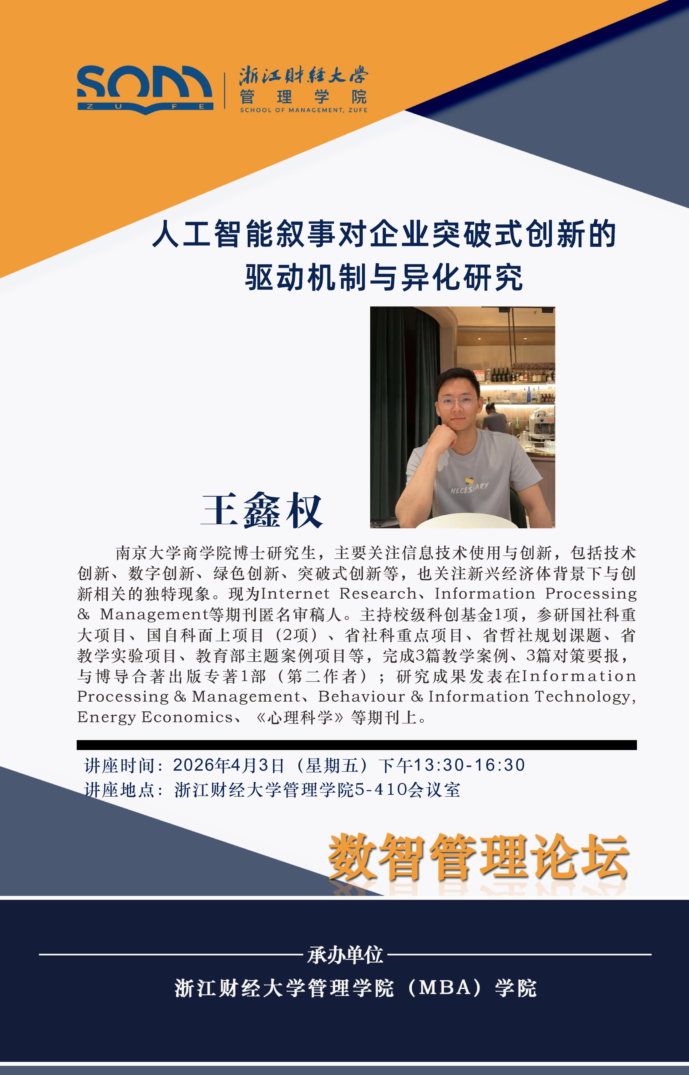 六合彩预测 新财经战略系列学术活动2026年第14期【学术报告】王鑫权:人工智能叙事对企业突破式创新的驱动机制与异化研究