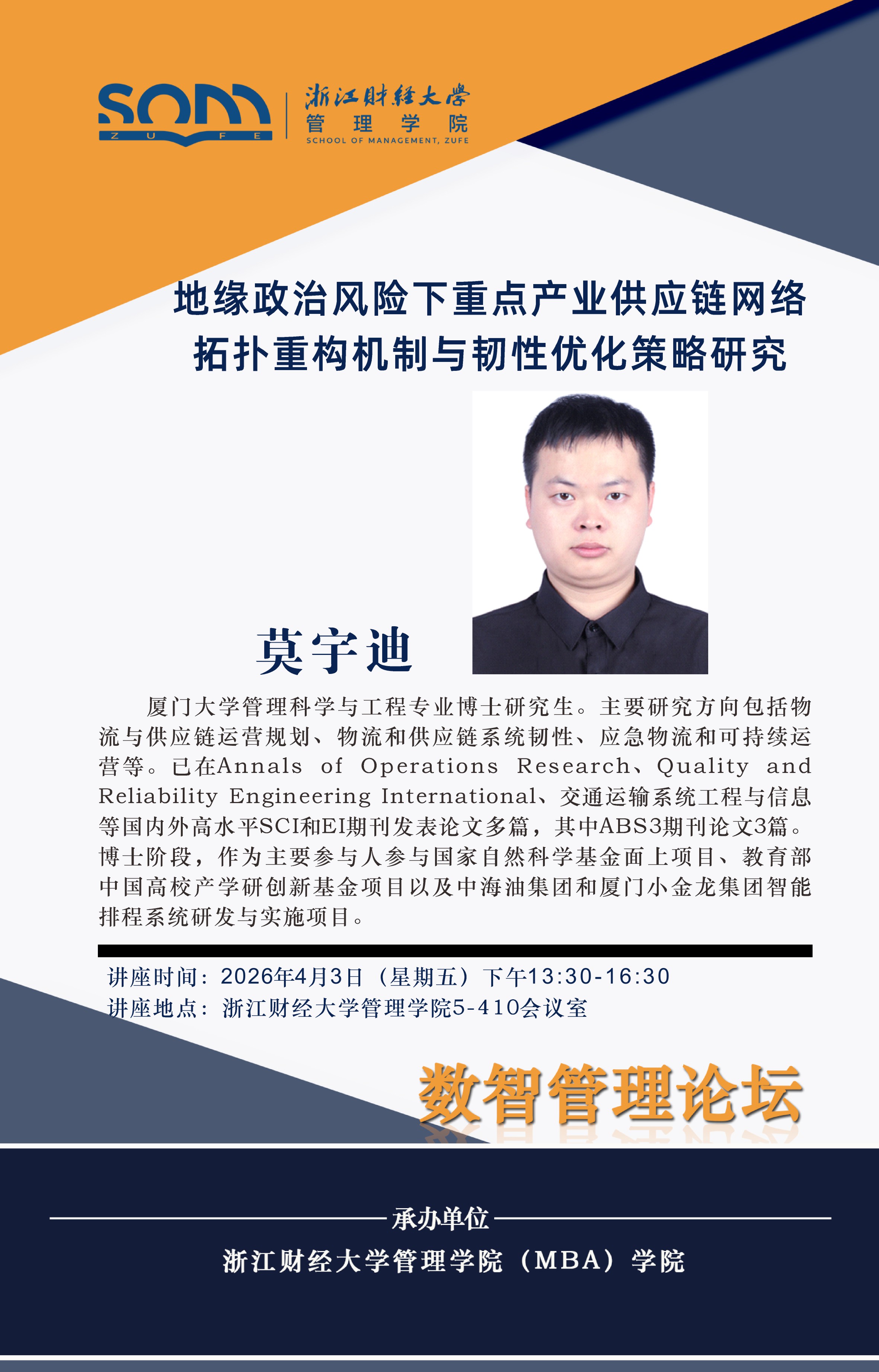 六合彩预测 新财经战略系列学术活动2026年第15期【学术报告】莫宇迪:地缘政治风险下重点产业供应链网络拓扑重构机制与韧性优化策略研究