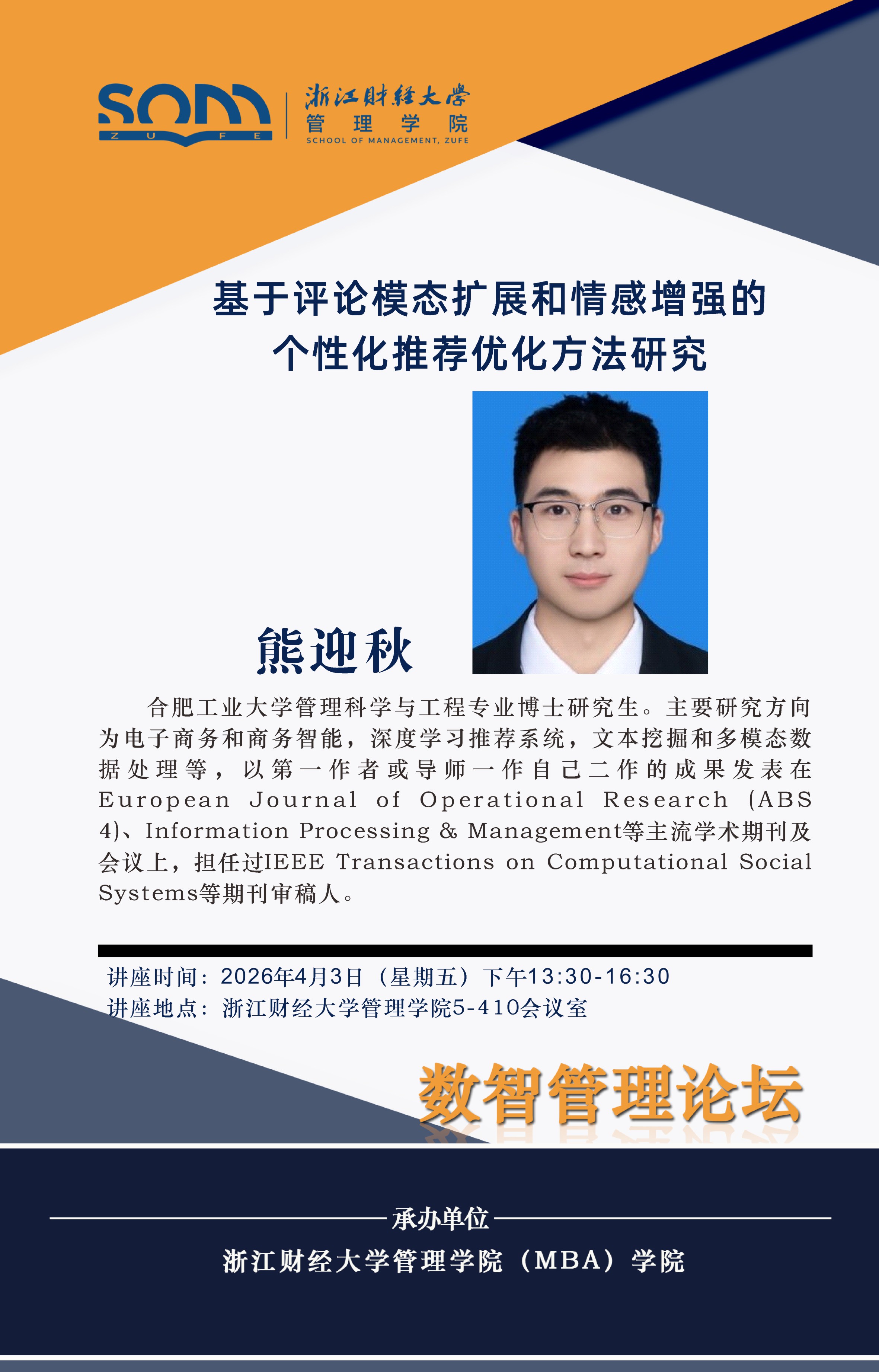 六合彩预测 新财经战略系列学术活动2026年第16期【学术报告】熊迎秋:基于评论模态扩展和情感增强的个性化推荐优化方法研究