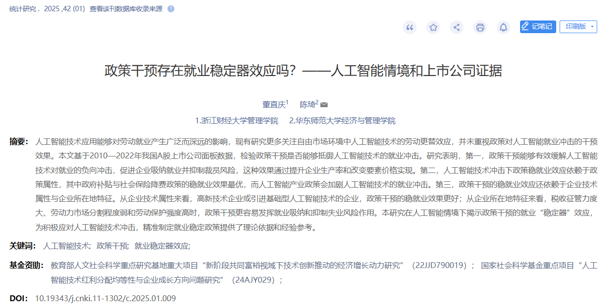 论文题目:政策干预存在就业稳定器效应吗?——人工智能情境和上市公司证据