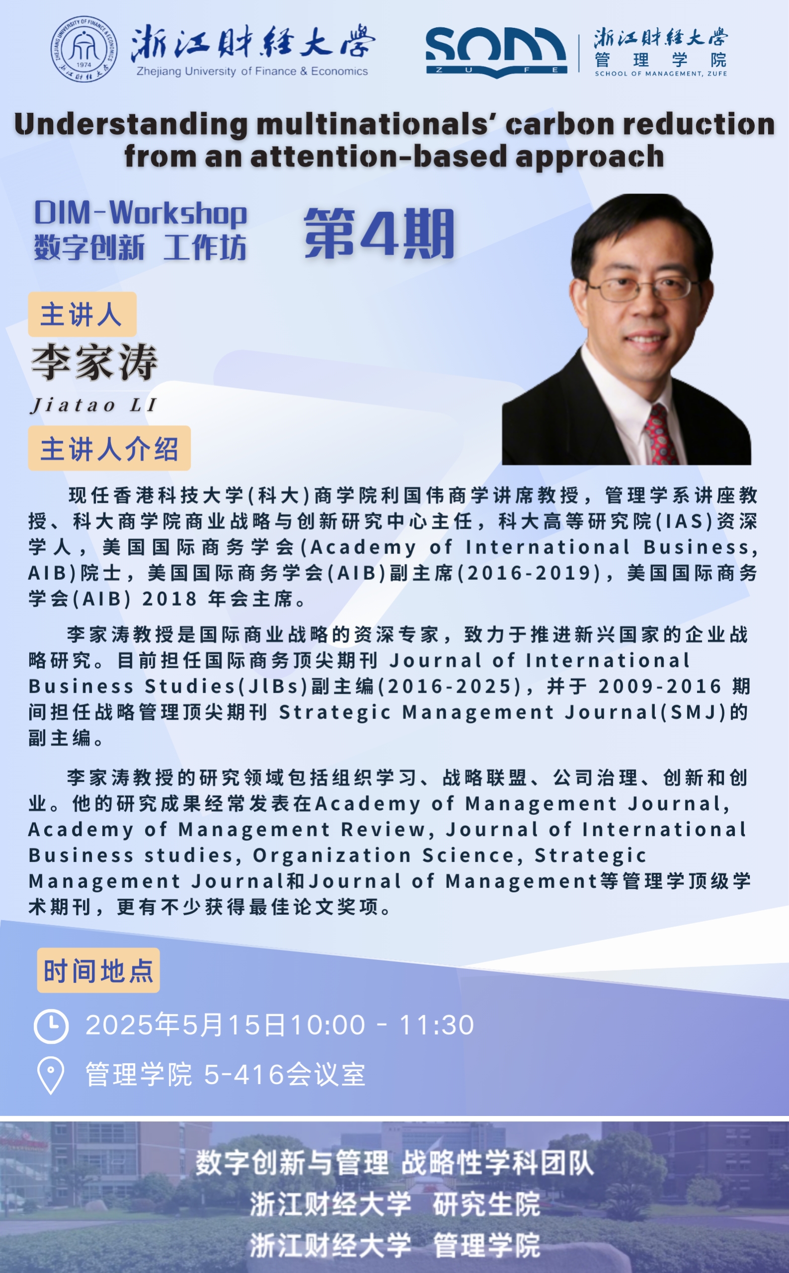 六合彩预测 新财经战略系列学术活动2025年第33期【数字创新工作坊】李家涛:Understanding multinationals’ carbon reduction from an attention-based approach