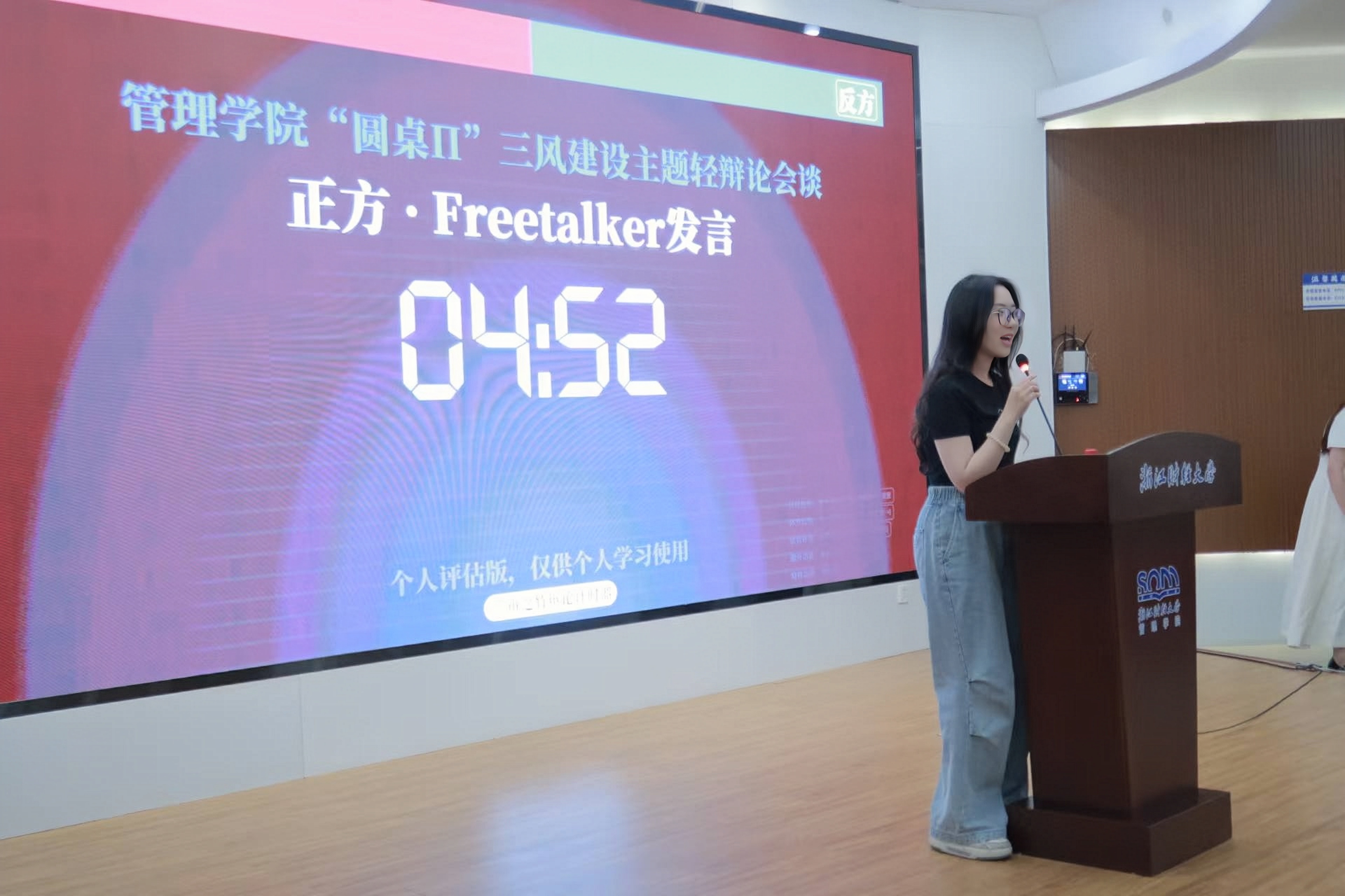 于2025年5月20日下午成功举办了首期“圆桌派”三风建设主题轻辩论会谈。本次辩论赛在“财赋馨风”优良学风建设工作室的支持下,通过学生视角剖析日常学习与制度管理的冲突点,为政策优化提供实践依据,助力教育教学工程提质增效。